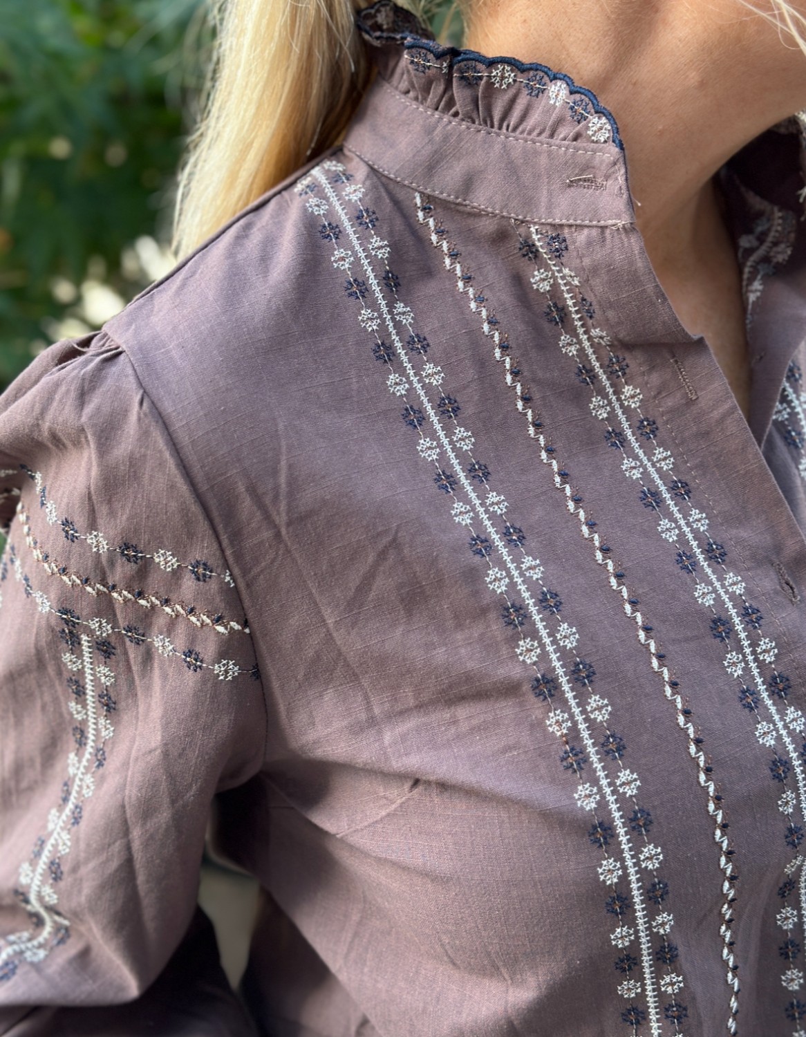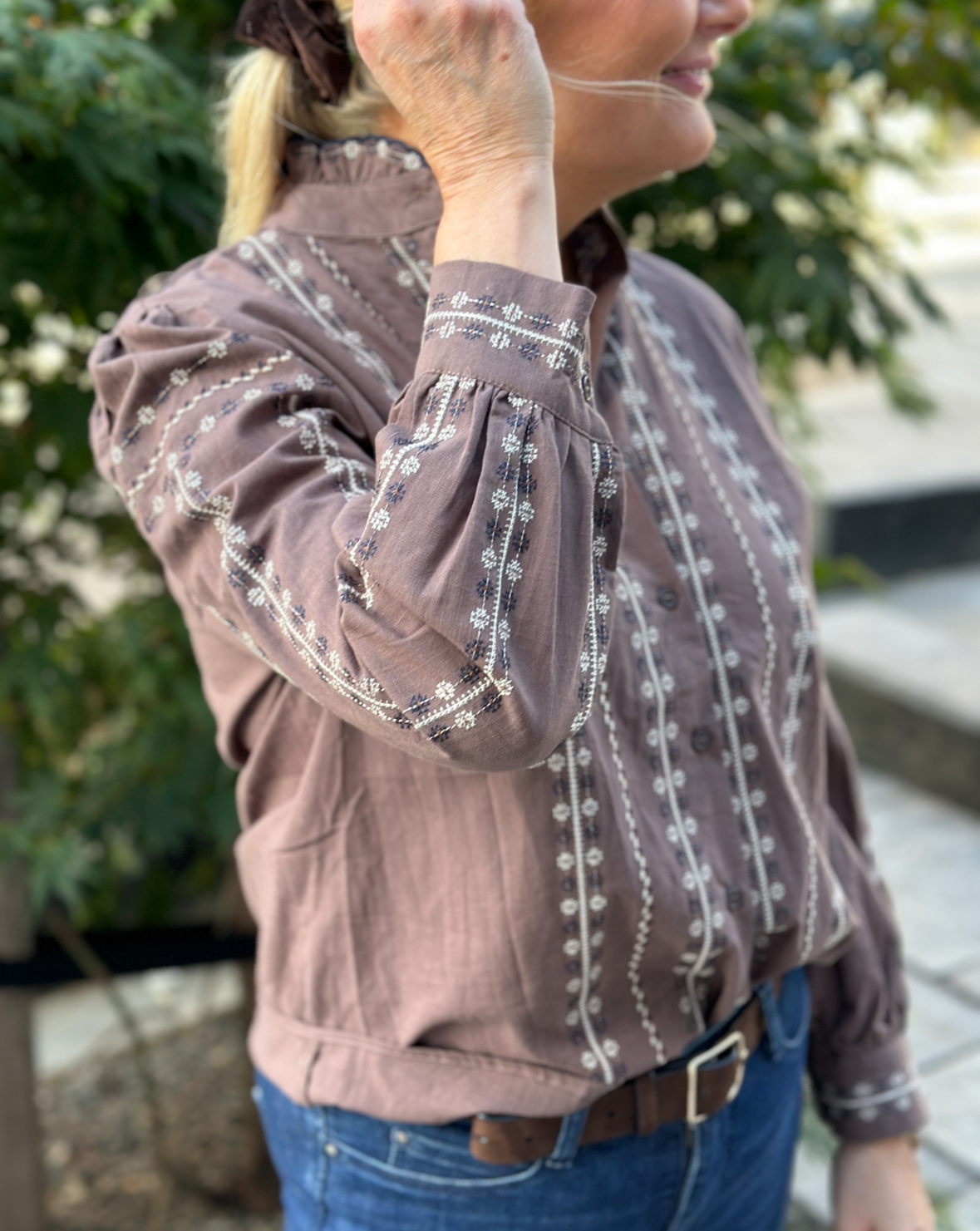 Fineste brune blusen med penge påsydde detaljer. Rysjer i halsen og knapplukking hele veien ned.
