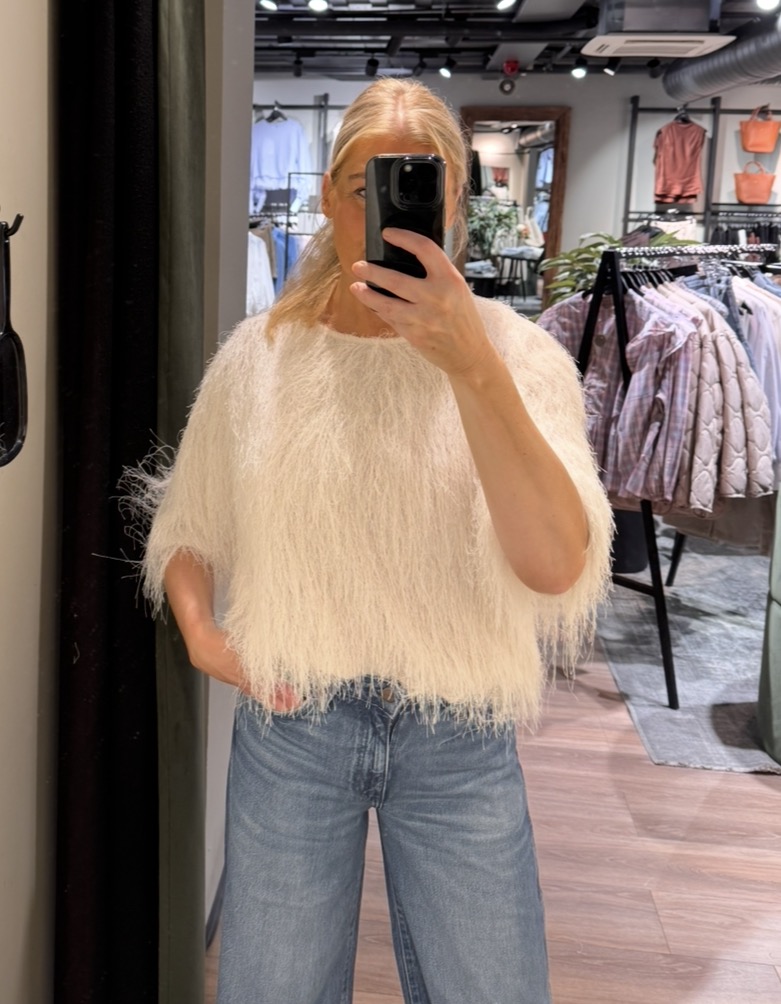 Bluse med kortermer og rund hals. Den har en løs og behagelig passform som gjør den enkel å bruke til både hverdag og litt mer pyntede anledninger. Stoffet har en fluffy struktur som gir blusen et mykt og litt unikt uttrykk.