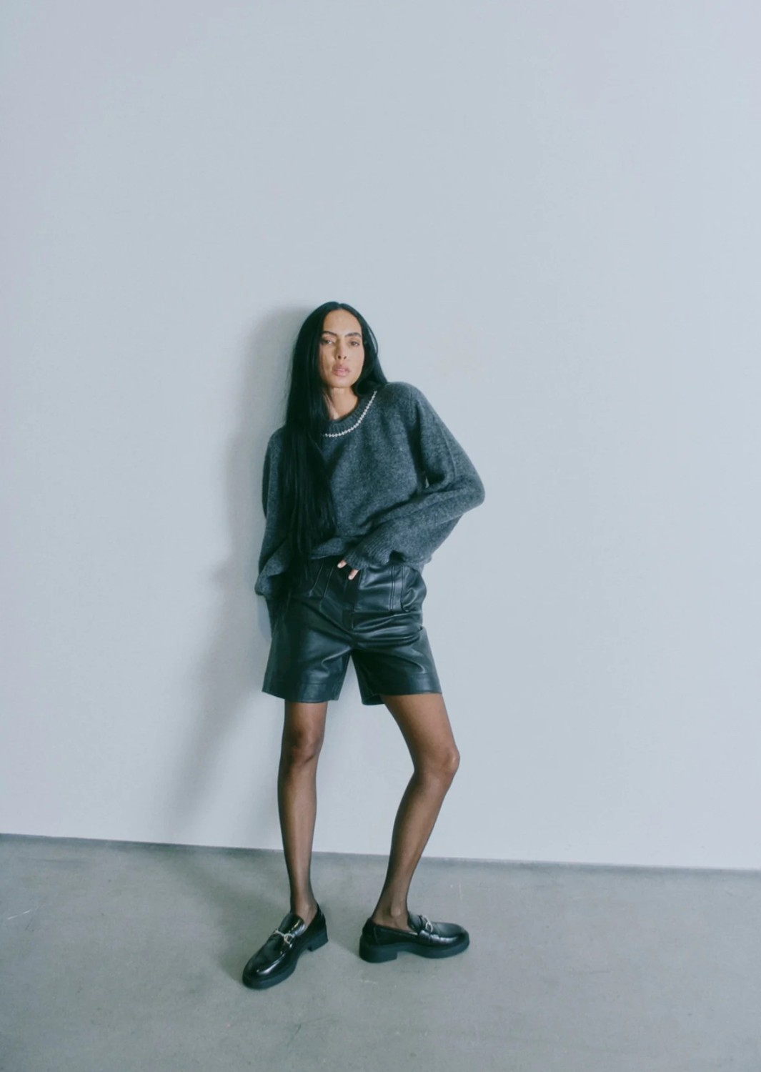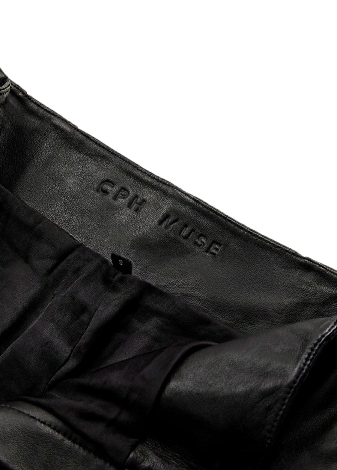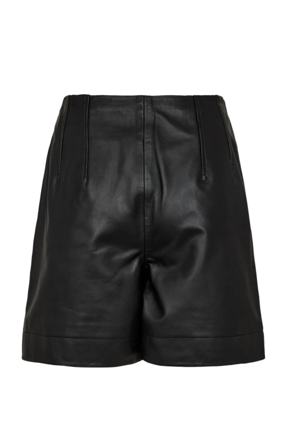 Et par shorts i et førsteklasses skinnmateriale med skjult knapp- og glidelåslukking, vide ben, sidelommer og legg foran.