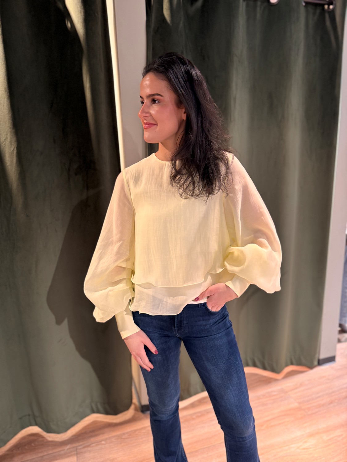 lange ermer med vide mansjetter og dekorative knapper. Nederst har den et lagdelt volangparti som gir et mykt og elegant utrykk.