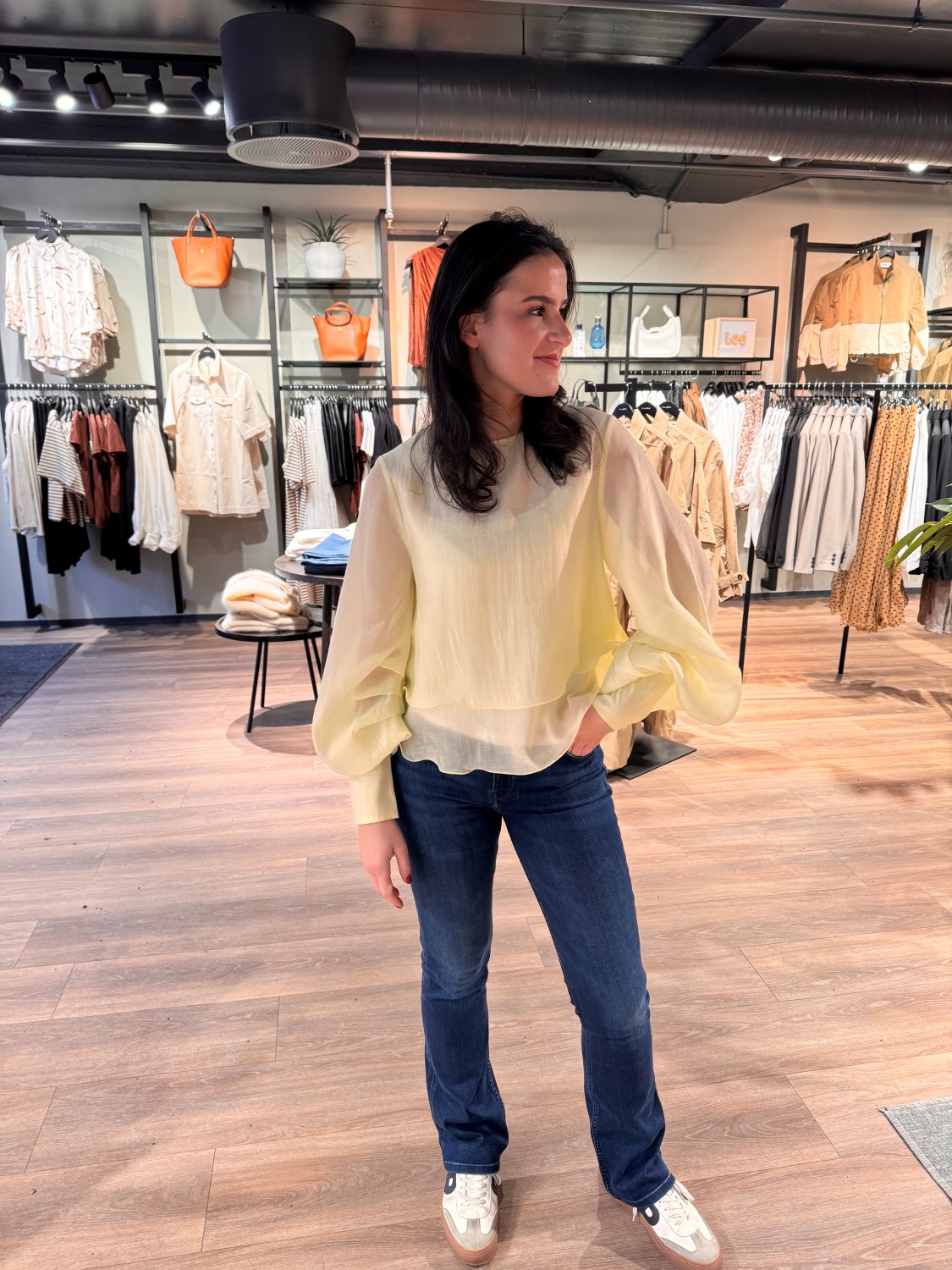 Blusen er lett, med en løs og feminin passform. Den har rund hals,