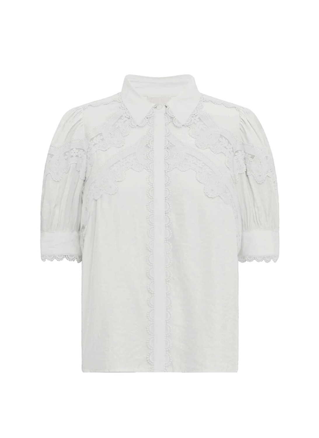 Lekker bluse med nydelige detaljer, krage med fin kant, og litt puff i ermene.