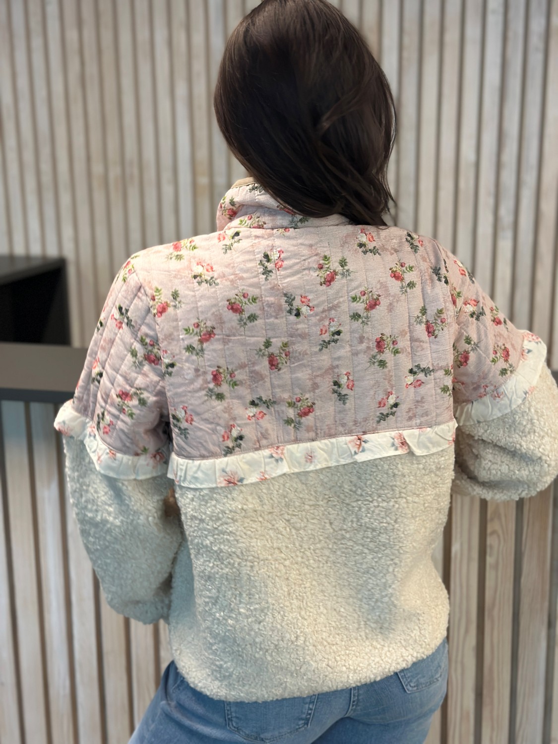 Dette er en superdeilig teddy half-zip jakke med et vakkert floralt mønster i dus rosa og med fine volanger som går i overgang til behaglig teddy stoff i krem. Den perfekte vår jakken.