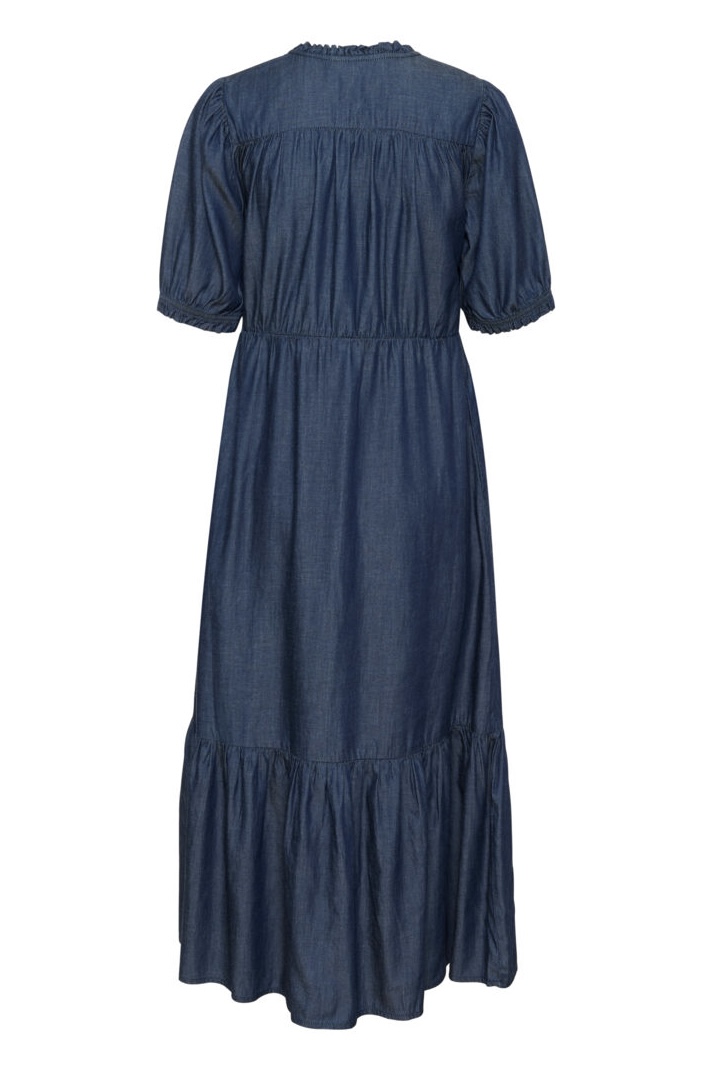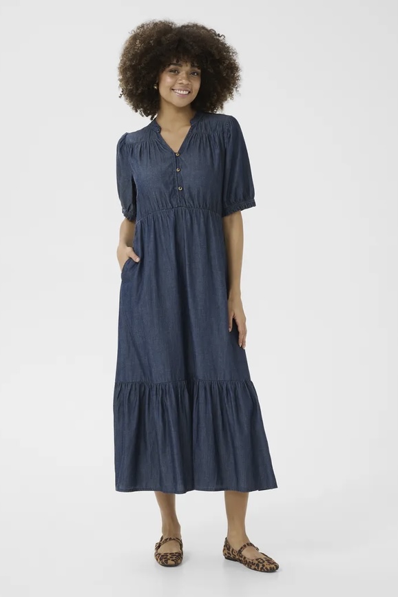 Stilig lang mørkeblå kjole laget av myk blanding av lyocell og bomull. Avslappet passform som passe perfekt til både hverdagsbruk og spesielle anledninger. Midi-lengde.