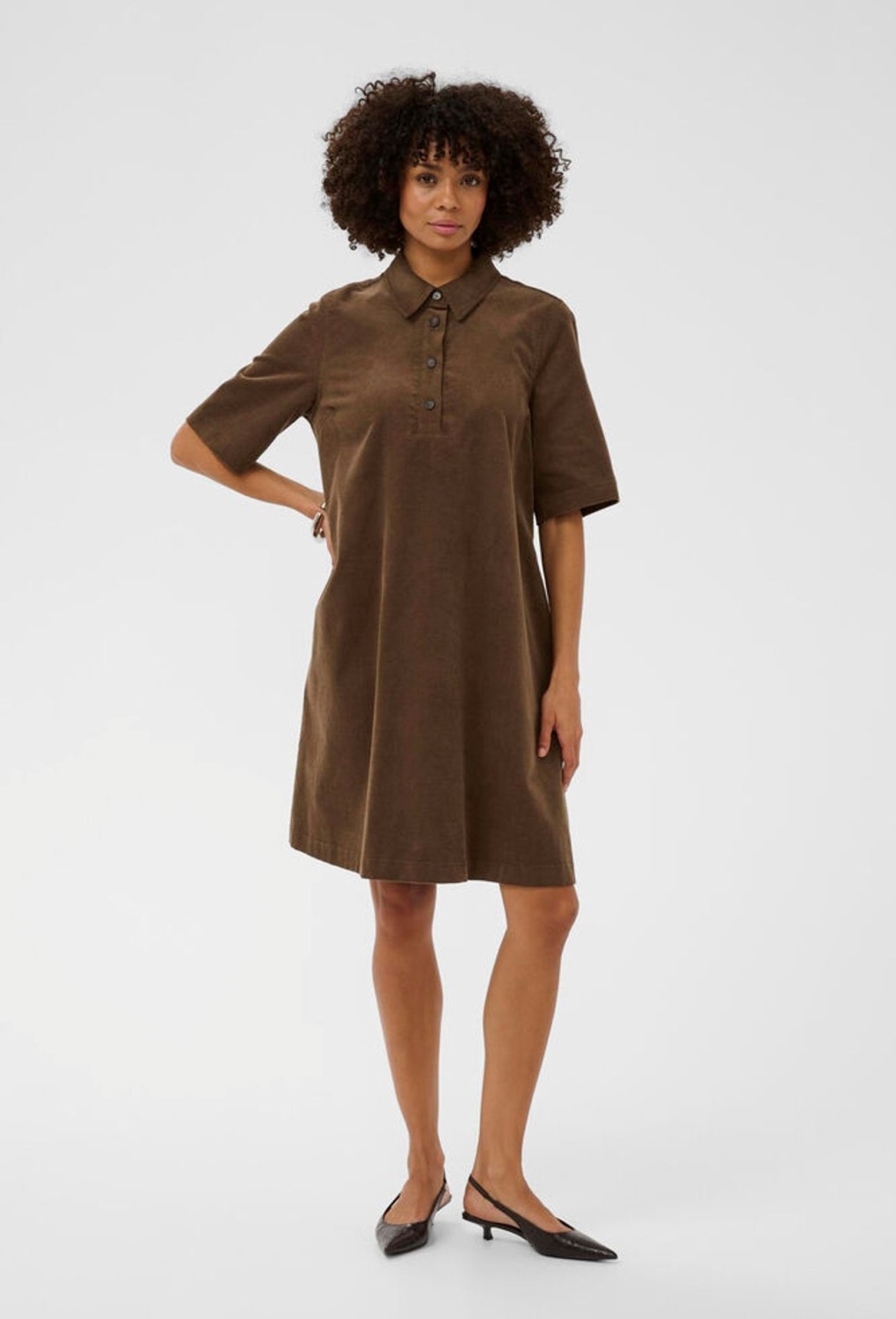 En tynnstripet cord kjole i A-line fasong, lommer i siden, krage, kort arm og knapper.