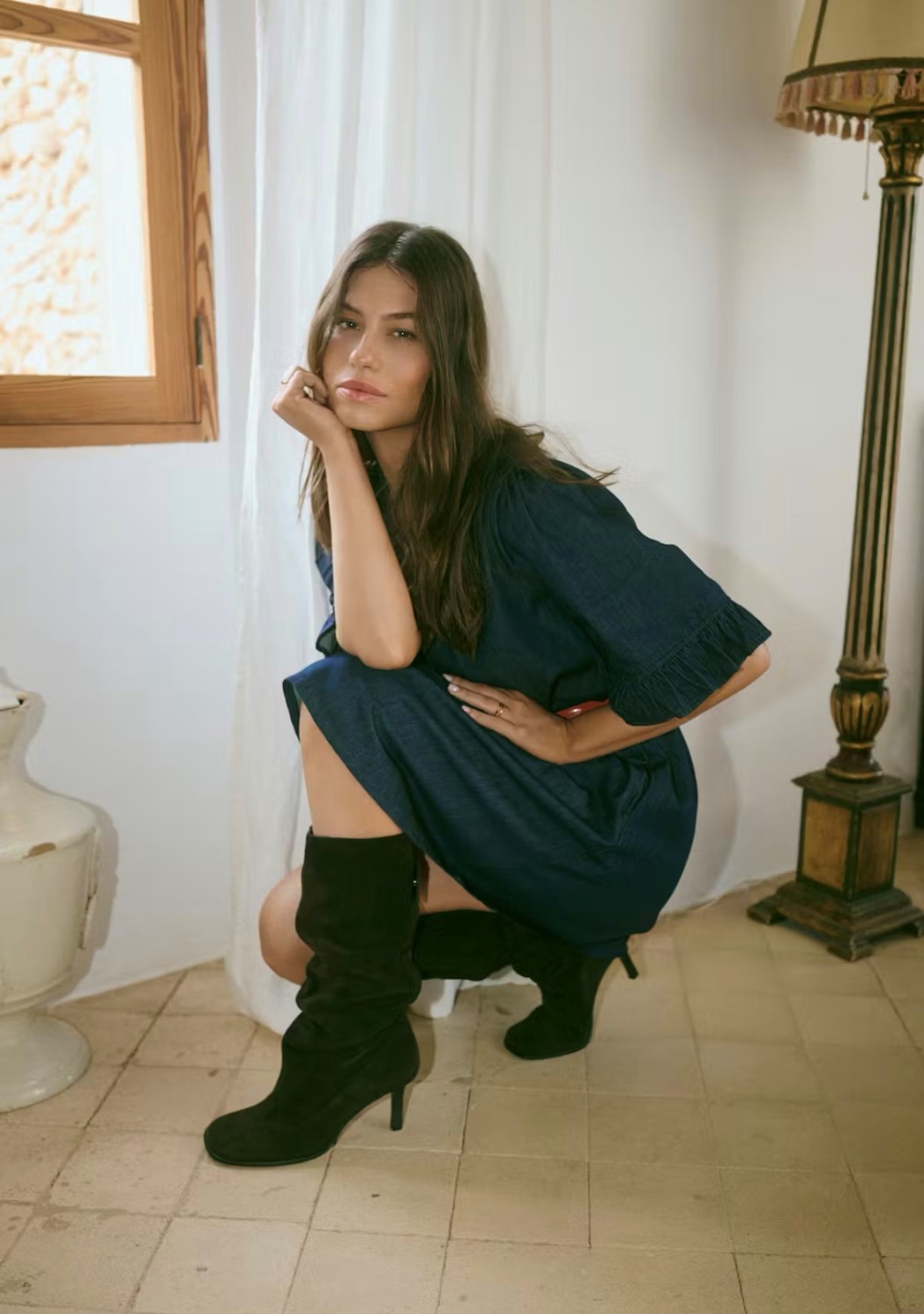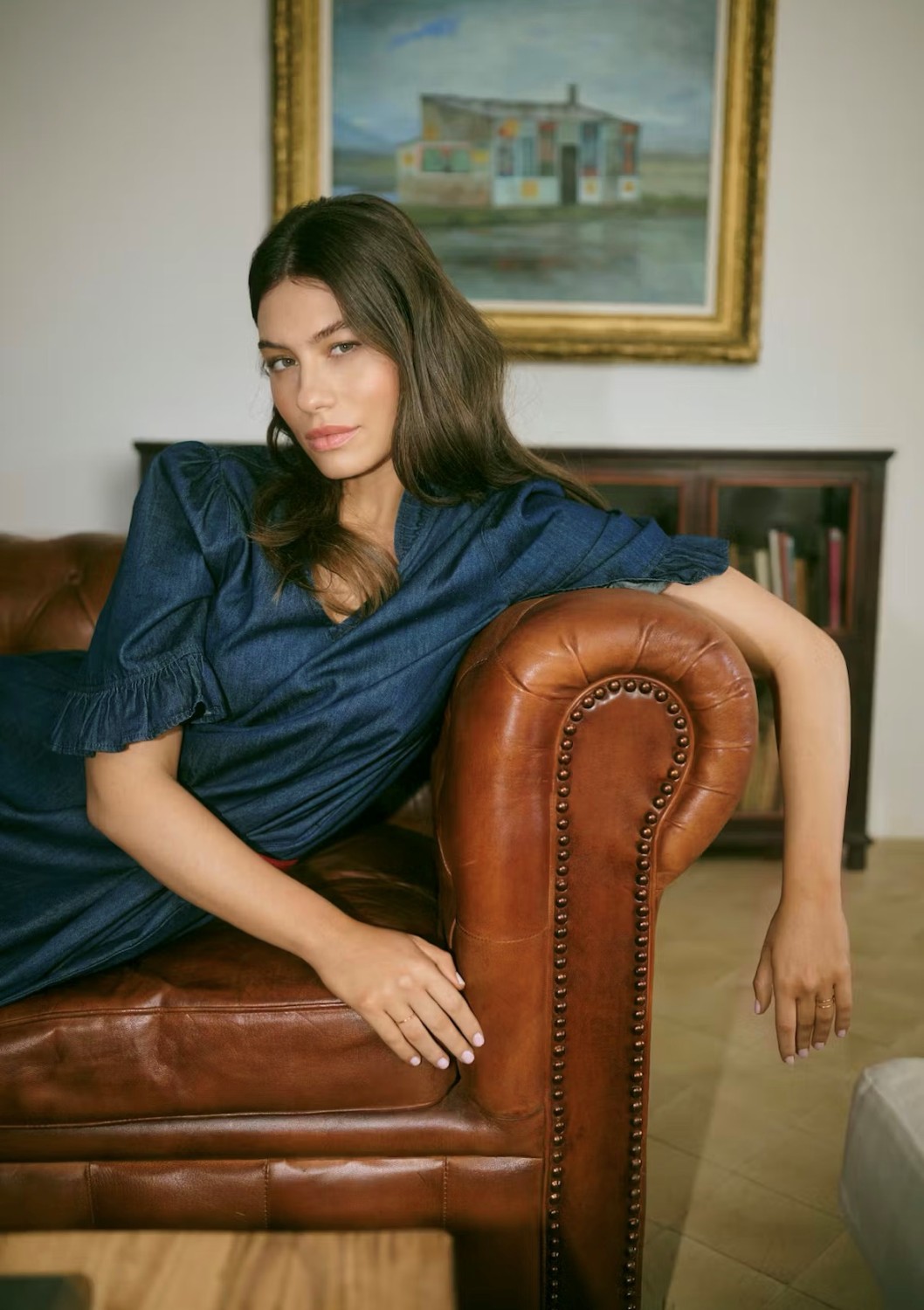 Denimkjole med v-hals, albuelange ermer med rysjer. Knelengde og passer fint til hverdags! Style den opp med et skjerf i halsen og noen høye boots!