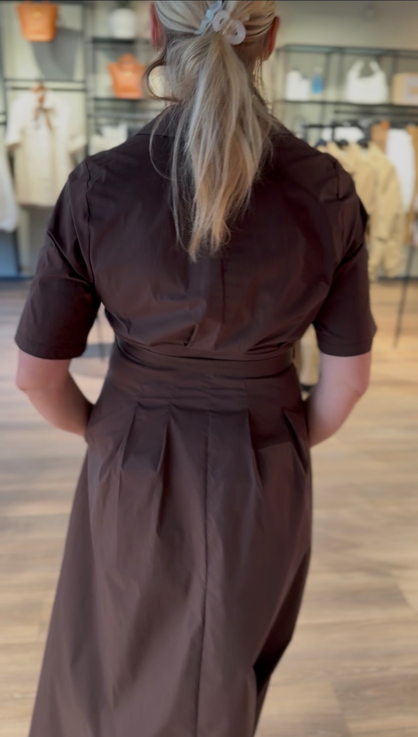 Skjortekjole med spiss krage,korte ermer og justerbart midjebelte.