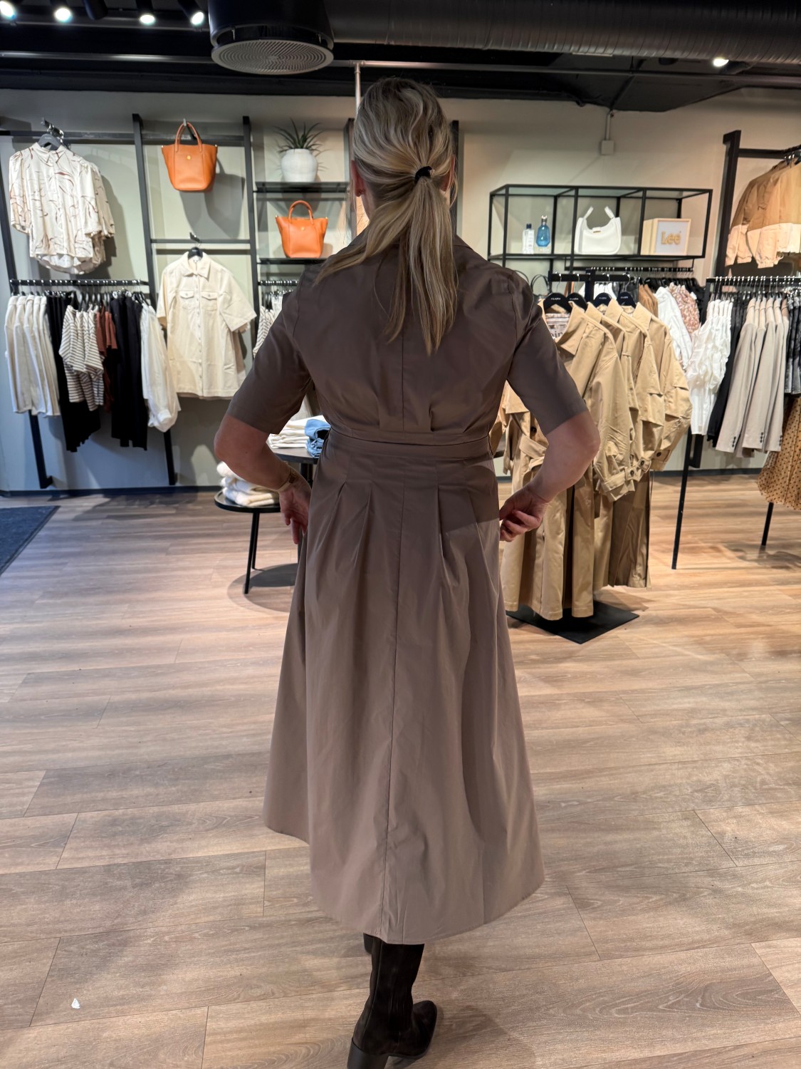 Skjortekjole med spiss krage,korte ermer og justerbart midjebelte.