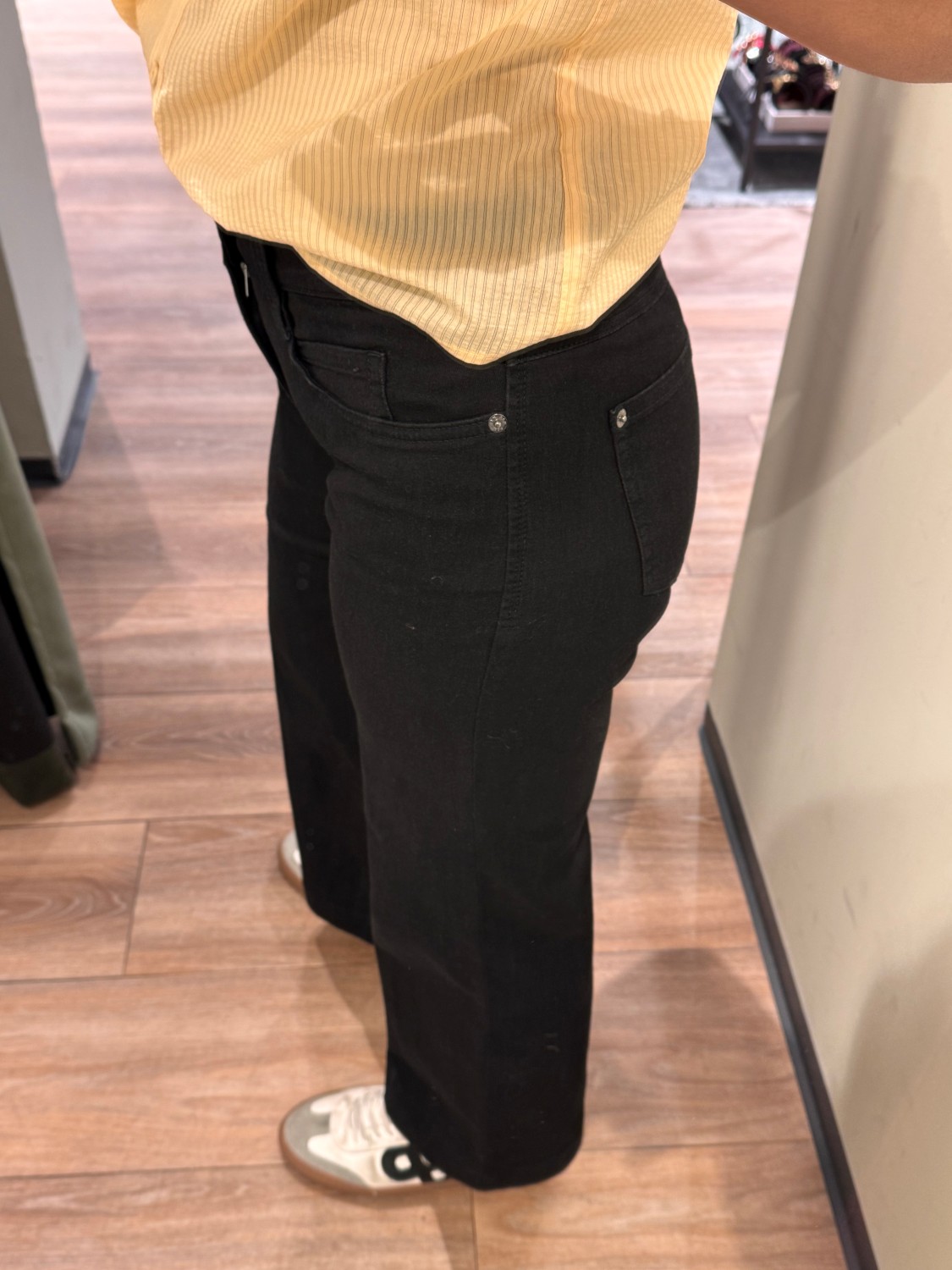 Favoritten Dream, her med vide ben. Buksen har medium livhøyde med flatterende lommeplassering. Sort vasket jeans som sitter godt over midjen og rumpa før den slipper og sitter løsere. Jeansen er veldig myk og stretchy i kvaliteten. Noen velger å gå ned en størrelse fra hva de vanligvis bruker på grunn av superstretchen.