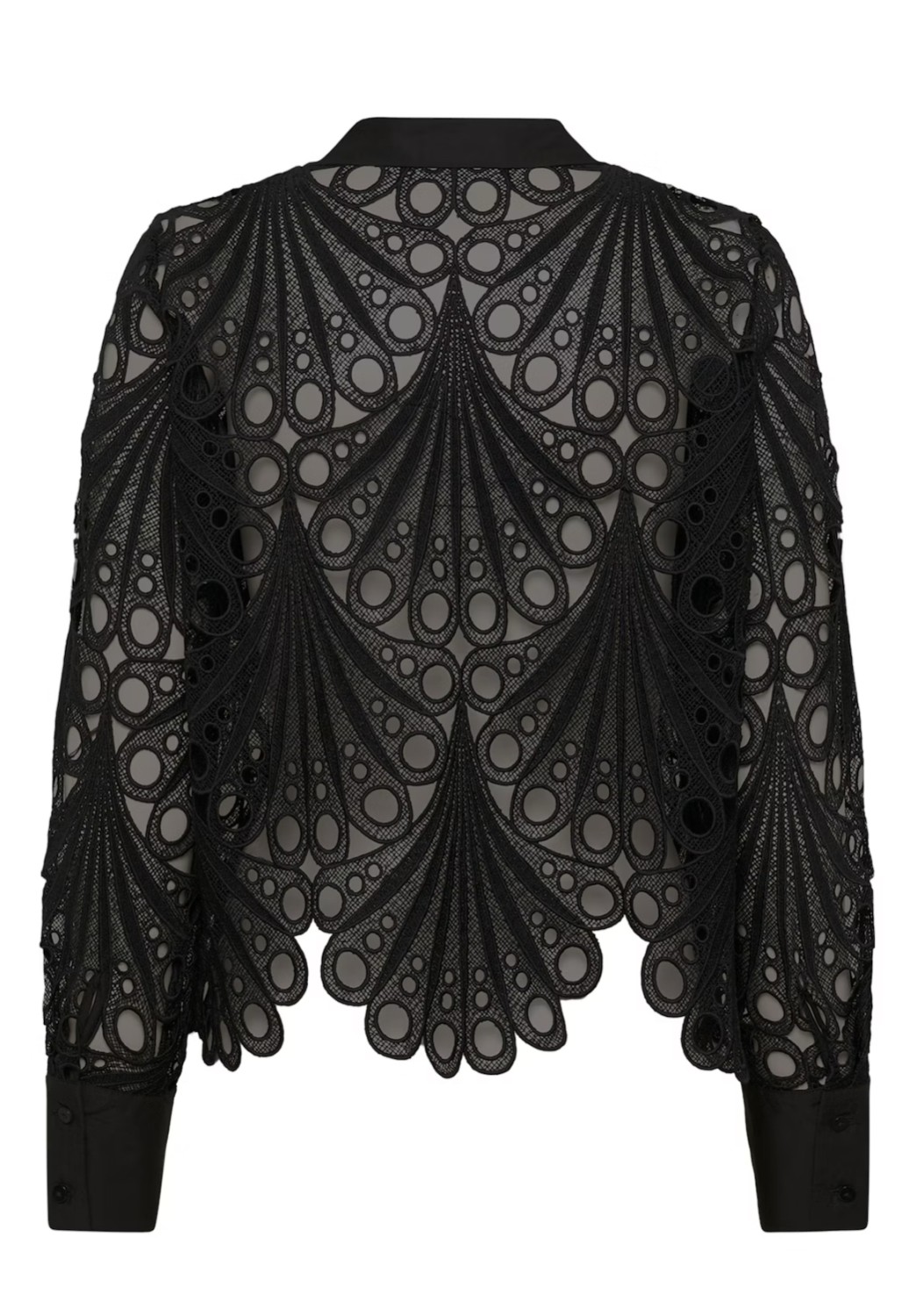 Sort bluse med lange ermer i dekorativ blonde med sirkulær og vifteformet broderi. Bølgete kant og mansjetter. Knappelukking og krage i fast stoff. Ledig passform med delvis gjennomsiktige partier.