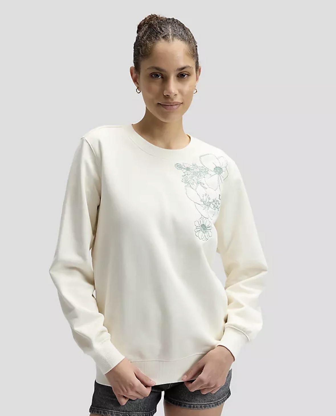 College genser med broderte blomster i en delikat grønn farge.
