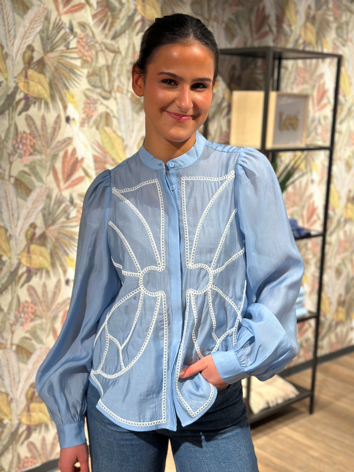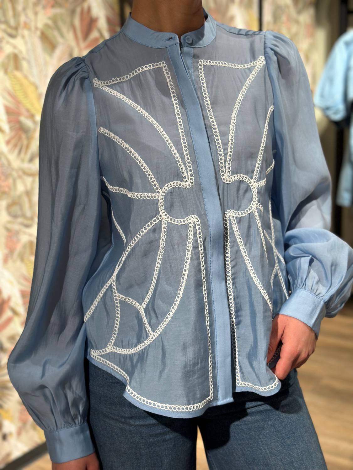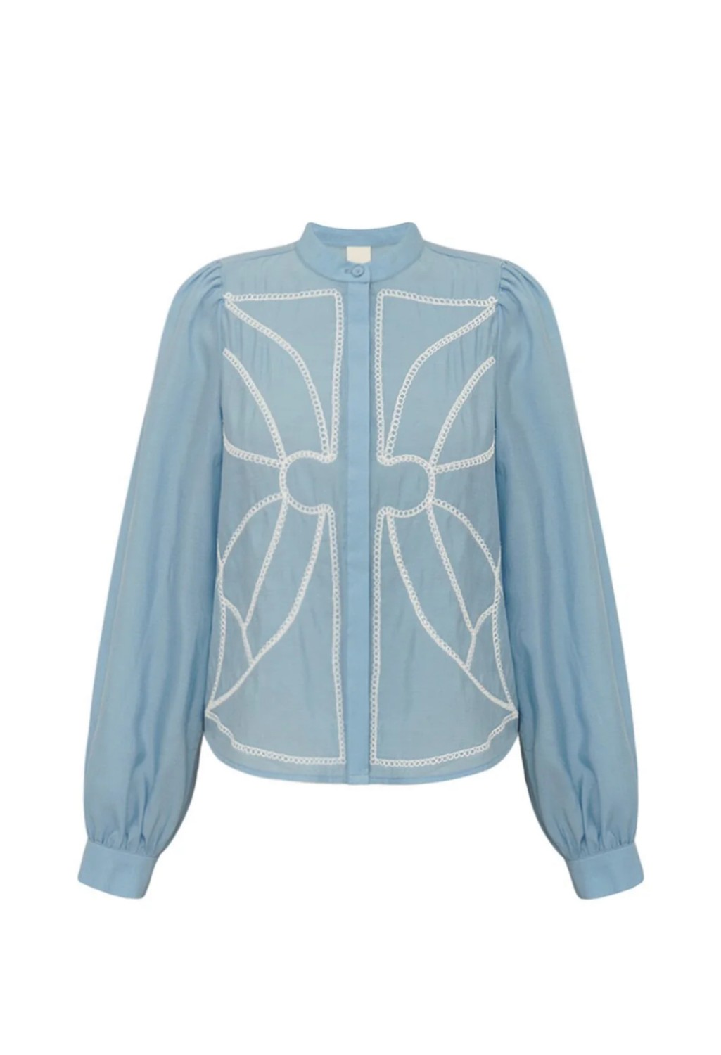 Lys blå skjorte med hvite broderier på forsiden. Høy krage og lange puffermer.