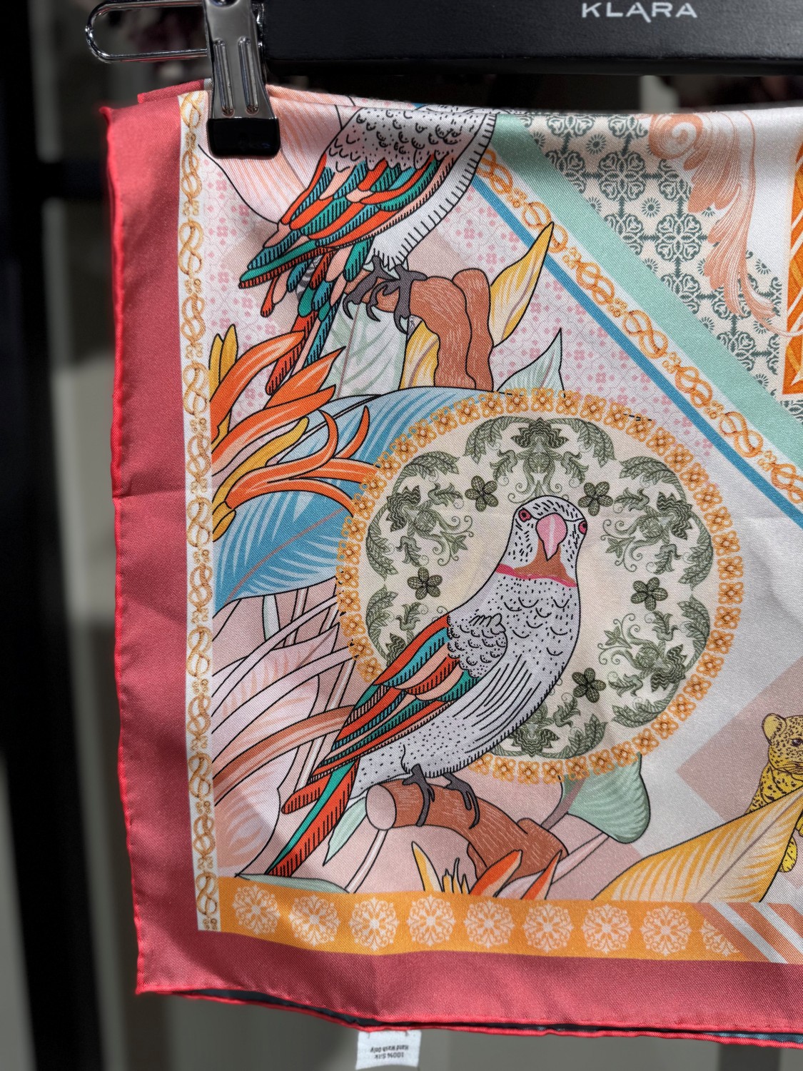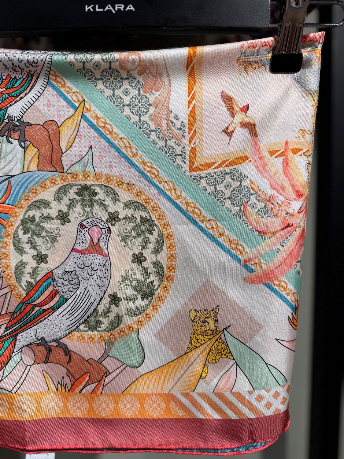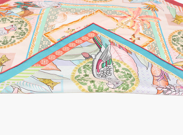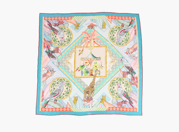 Eksklusivt dobbelprintet silkeskjerf med håndsydd rulle-søm.