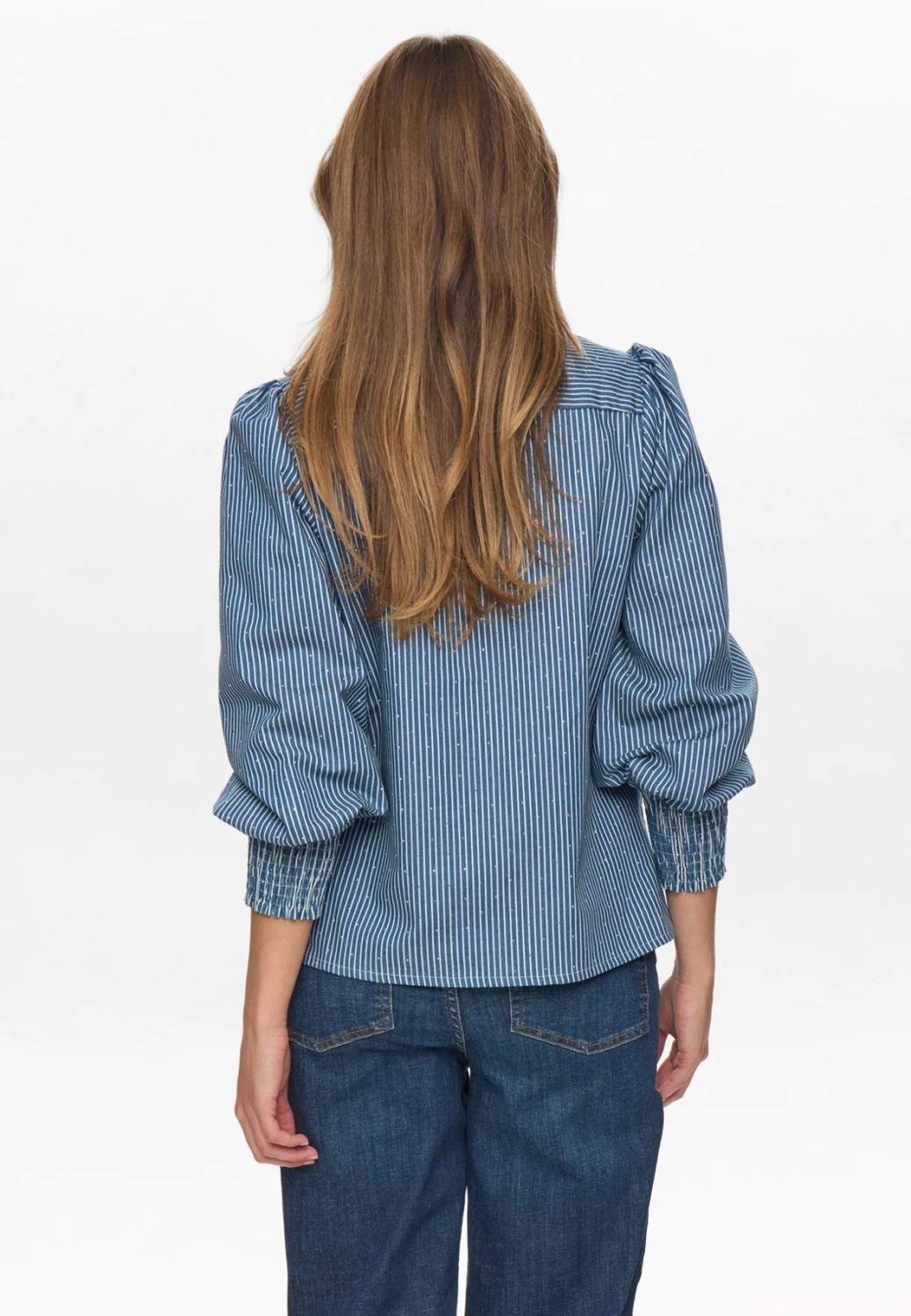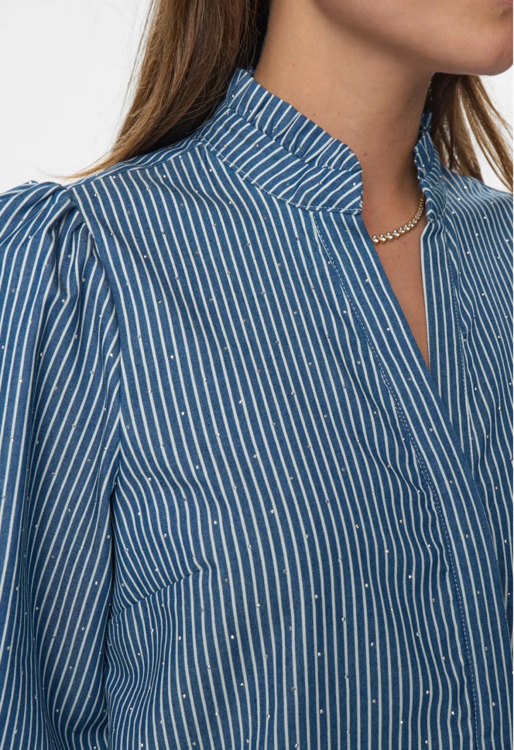 Stripette blå bluse med små diamanter. 3/4 ermer og v-hals. Skjult knappelukking foran.