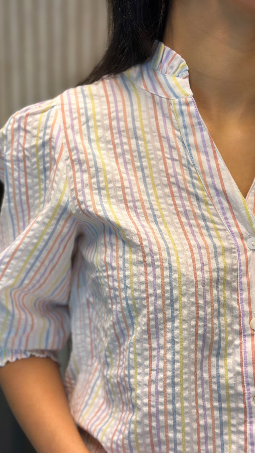Skjorta har fine striper i forskjellige farger, en skikkelig fargerik vår skjorte med 3/4 arm, v-hals og knapper.
