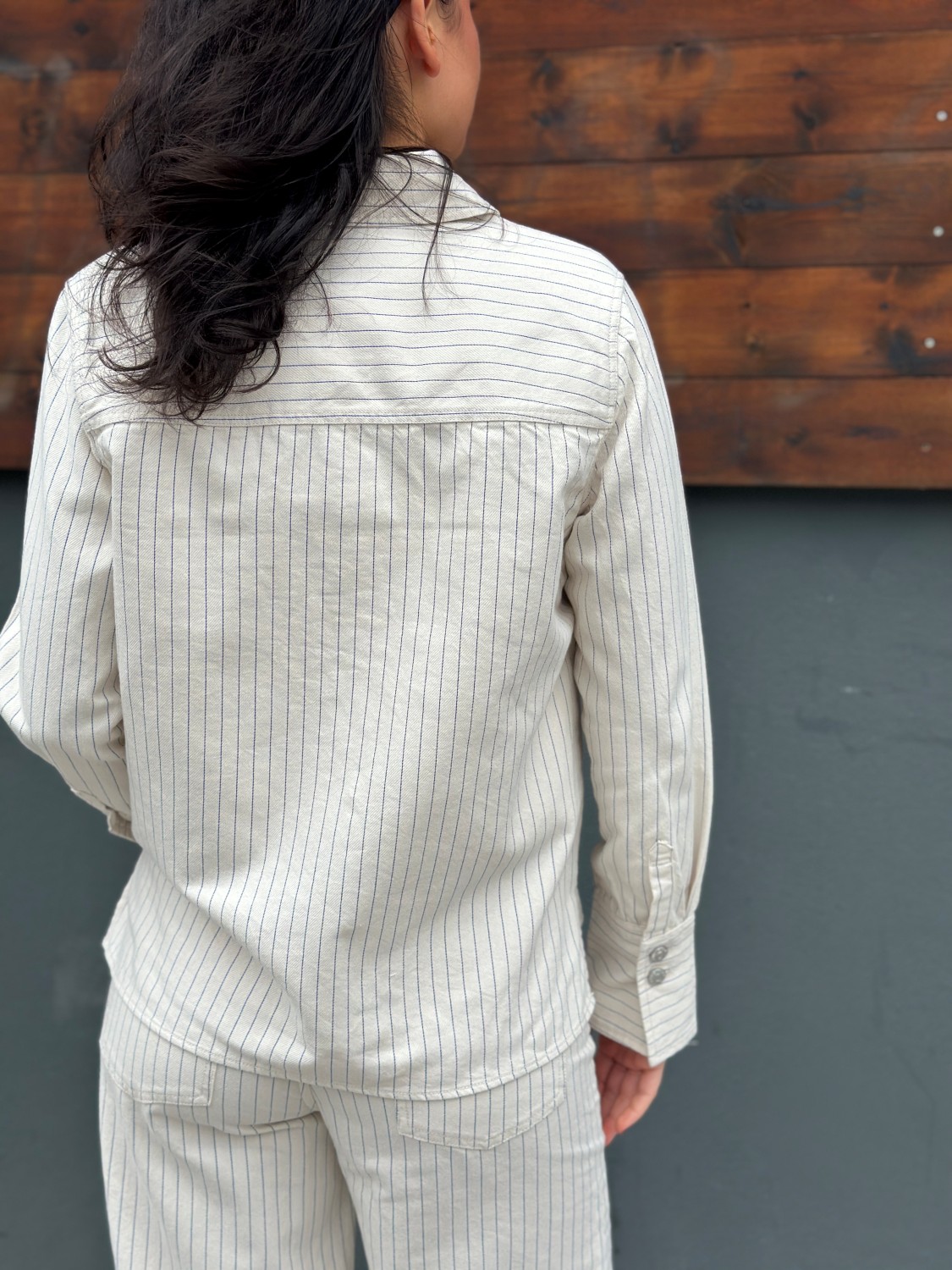 Tøff skjorte jakke fra PULZ, knapper og krage, mykt tynt bomullskvalitet med kremfarget bunn og blå striper.
