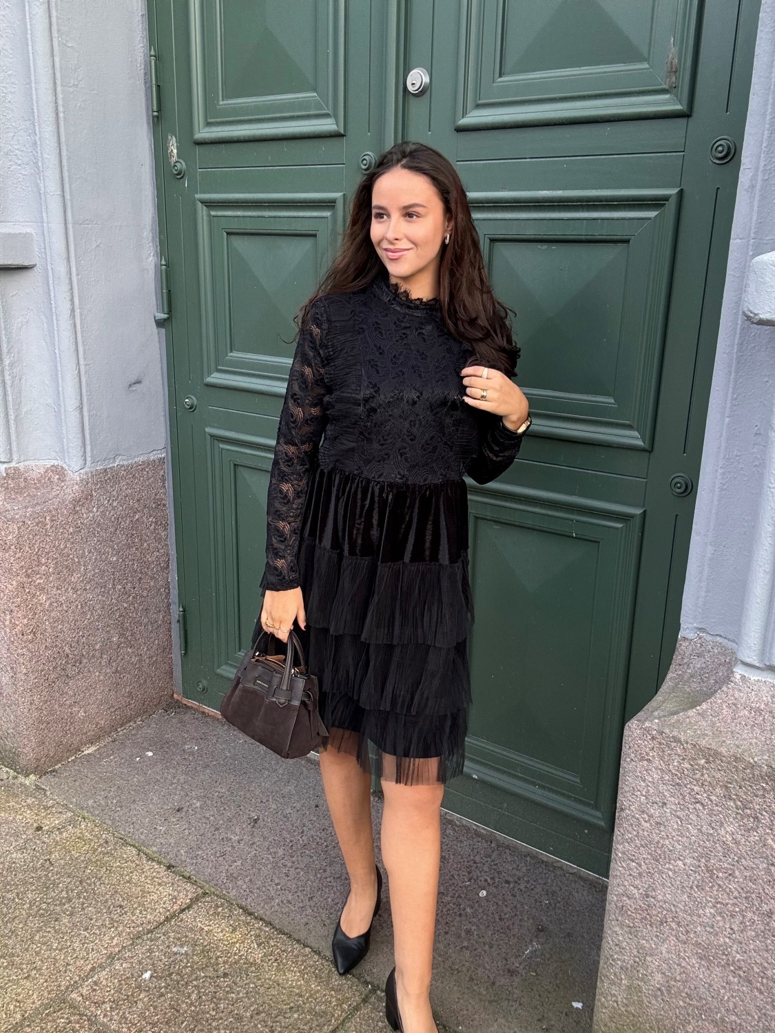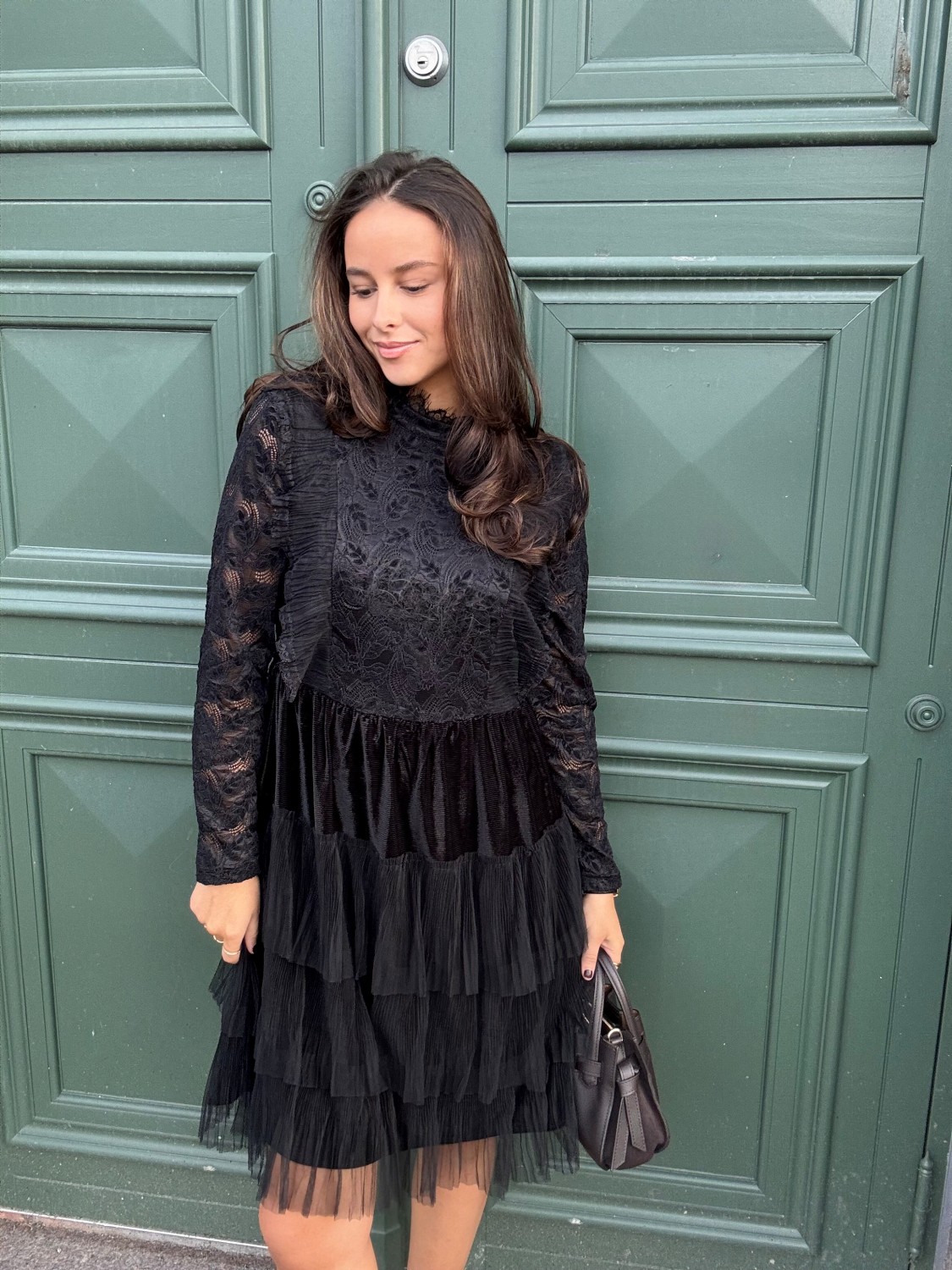 PZViolet er en helt nydelig og enestående kjole som passer perfekt mot jule og nyttårs sesongen! Den er utført med lag av pent tyl oppå ett glitterlag og har en gjennomgående stripe av velour stoff som gir det lille ekstra til kjolen, pen utringing med blonder rundt halsen og ermer som fint kan justeres til albue lengde om ønsket. Én knap bak på ryggen.