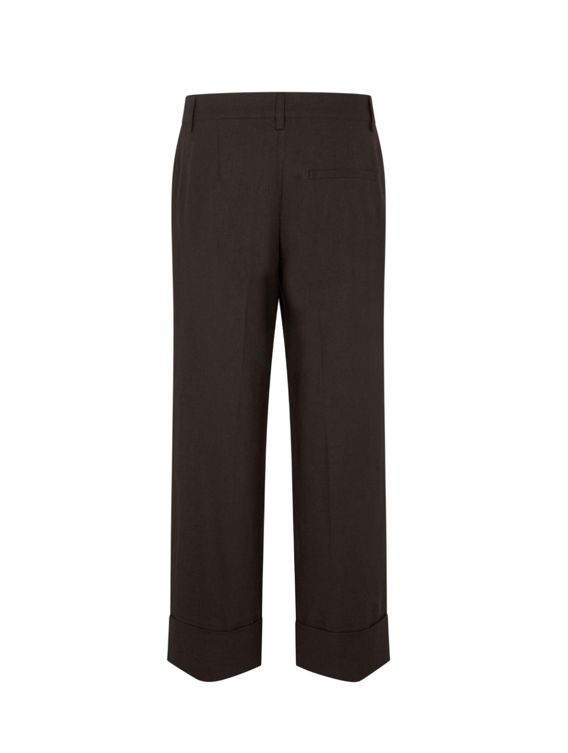 Brun bukse laget av lin og bomull. Vid modell med lang oppbrett nederst.