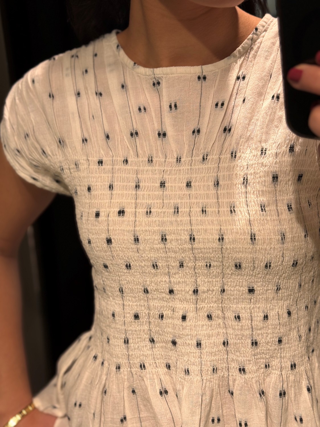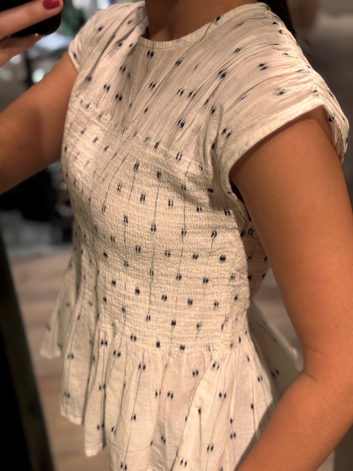 Bluse med lett struktur i stoffet, rund hals og korte ermer. Den sitter tett over overkroppen og har en liten utsving nederst/peplum. Stoffet har små, fine prikker som gir et delikat uttrykk.