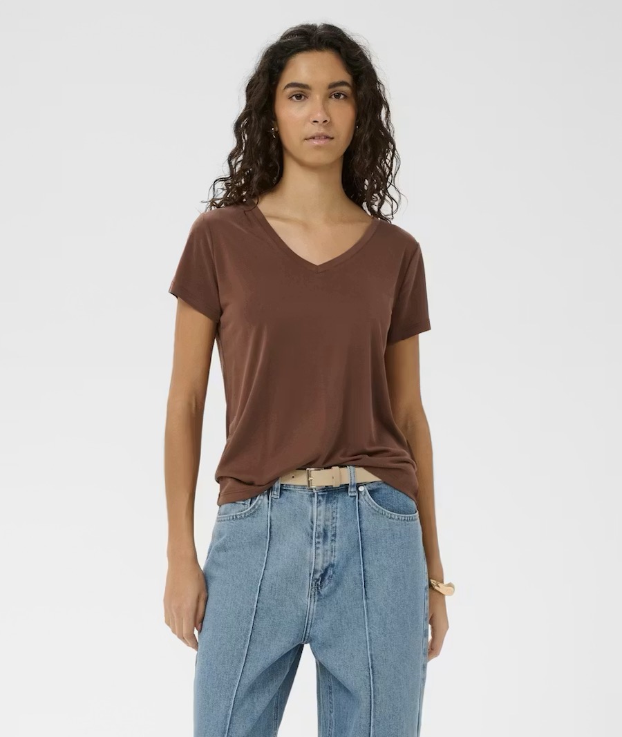Lett og myk t-skjorte med v-hals og korte ermer. Fint rustet brunfarge.