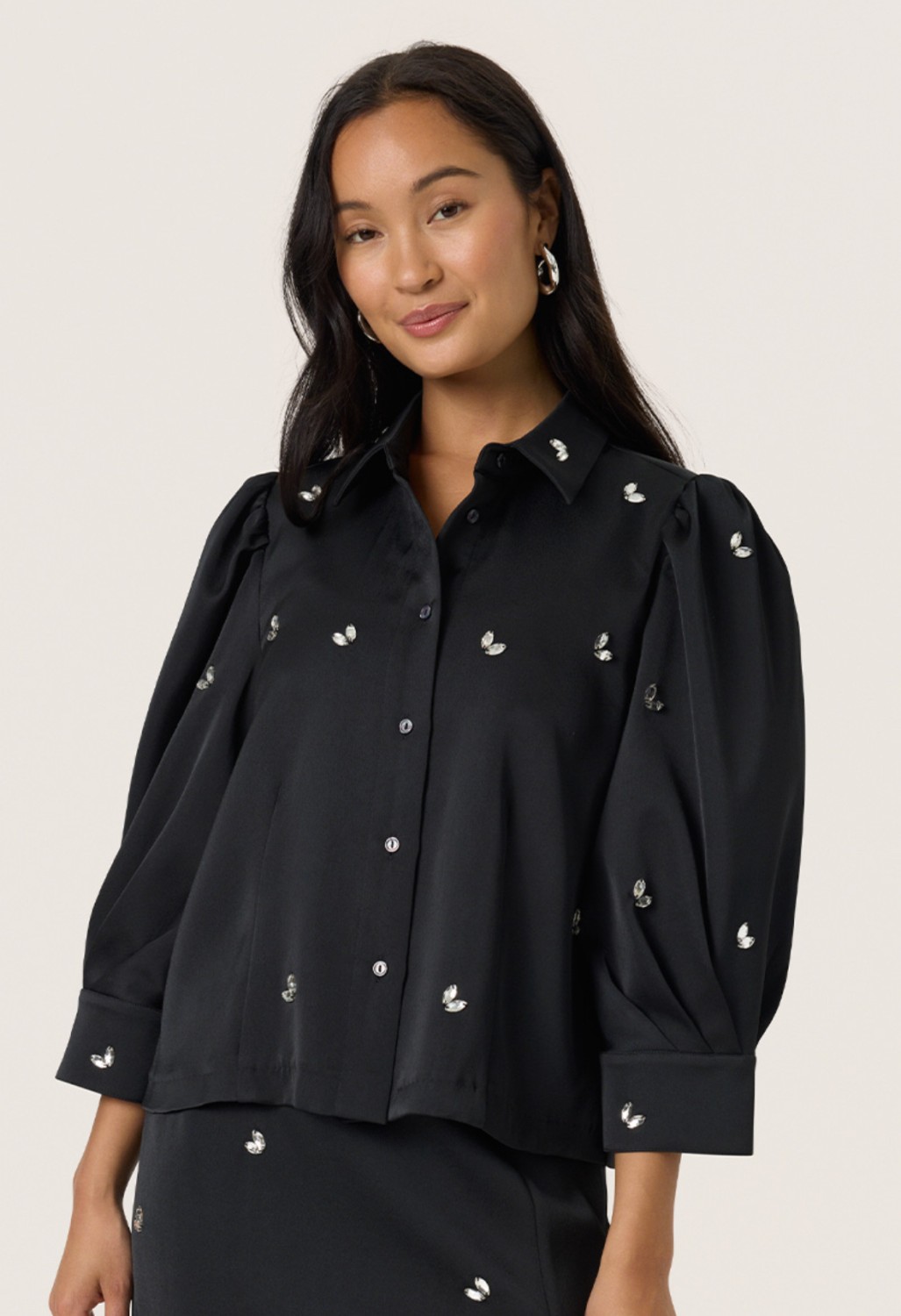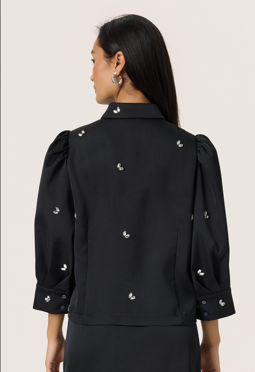 En fin, og så gøy bluse samtidig! Litt puff i ermene, klassisk krage og knapplukking foran, med påsydde diamanter.