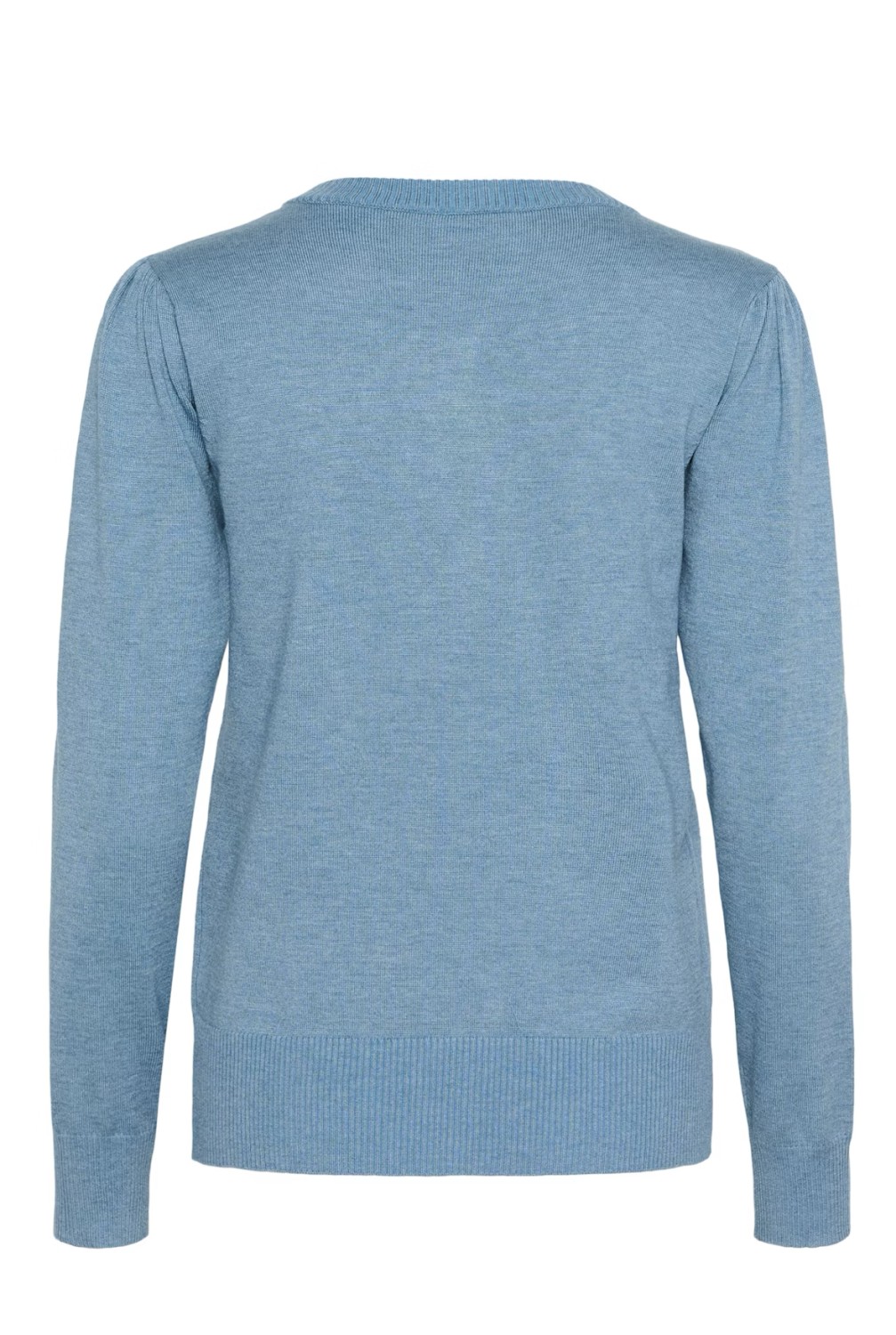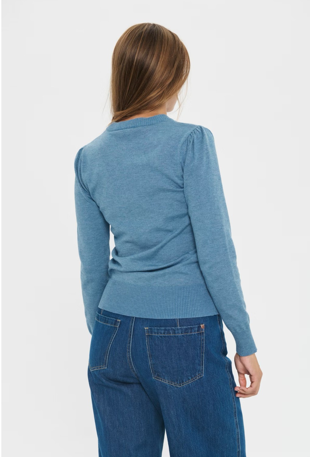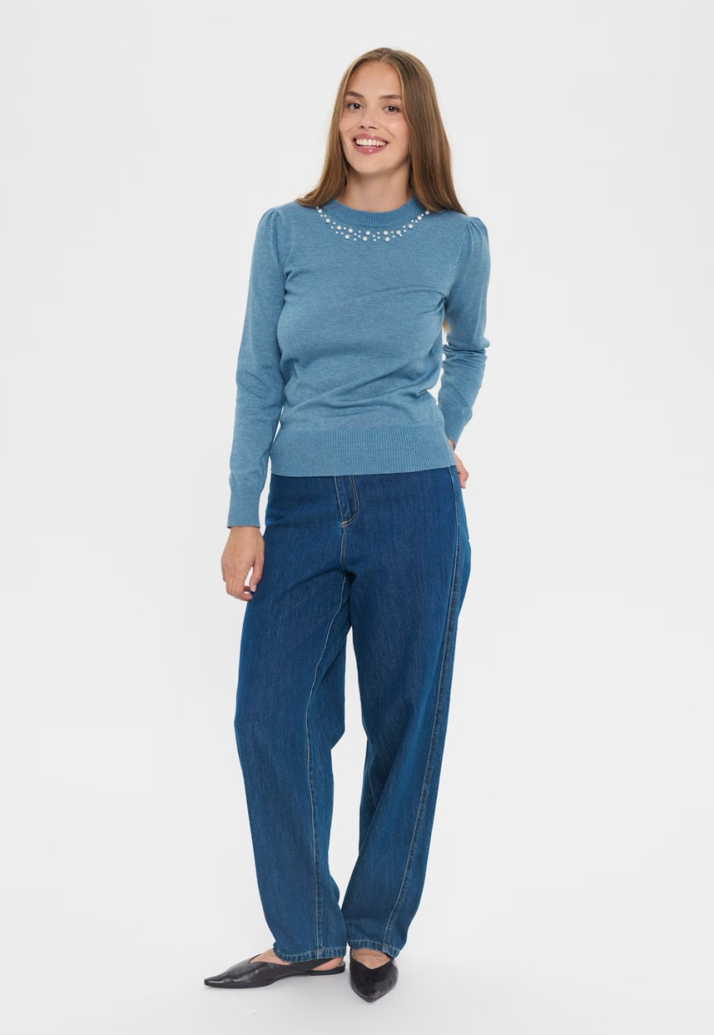 En pen genser med rundt hald og en dekorativ detalj ved halsen – perler. God stretch, og litt puff i skuldrene. Perfekt til hverdag og jobb, men kan også styles opp til fest og høytid!