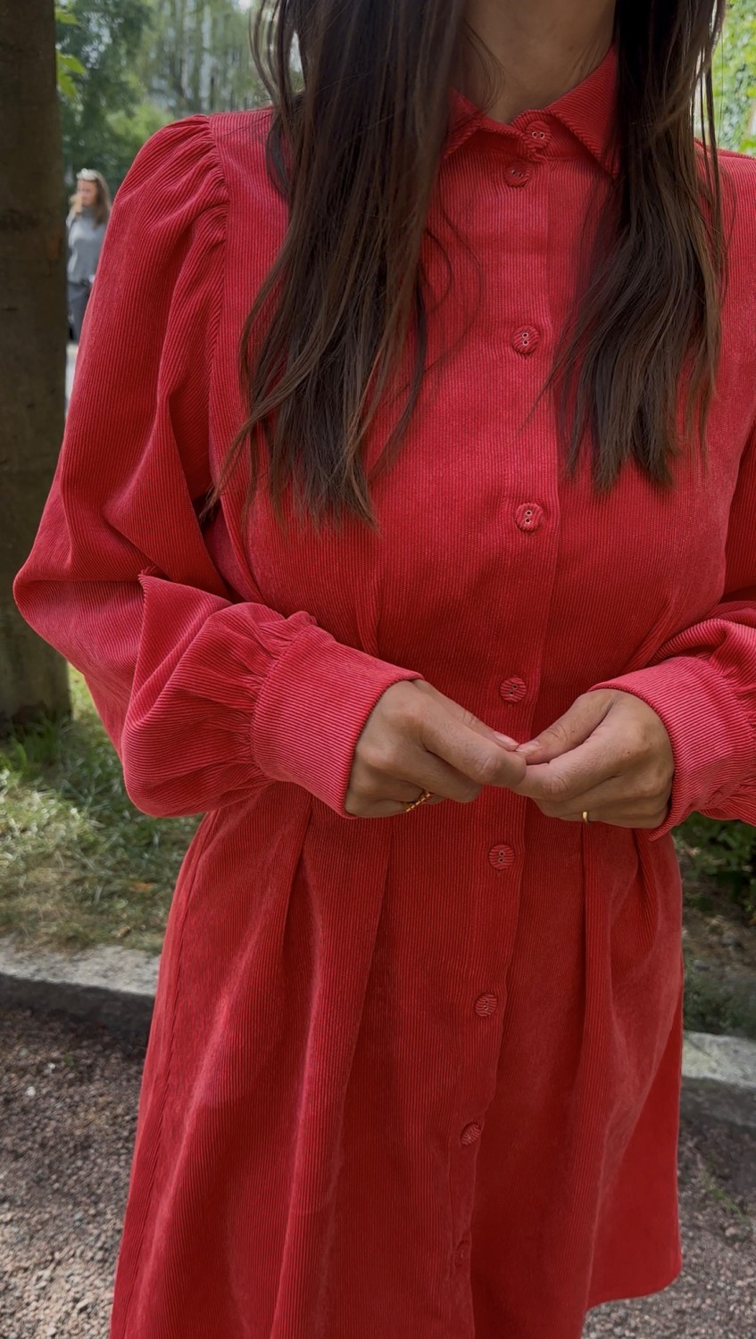 En korall skjortekjole i lett kordstoff
