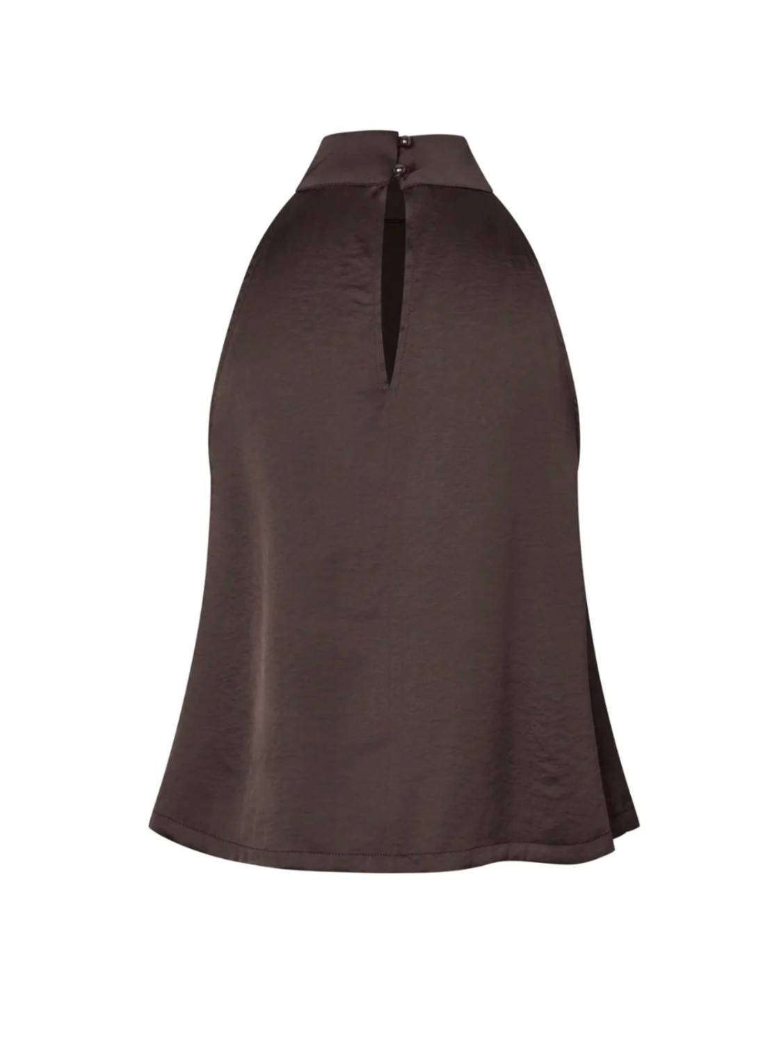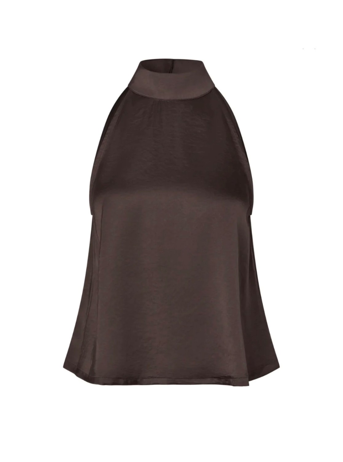 Høyhalset halterneck i en delikat brunfarge og sateng look.